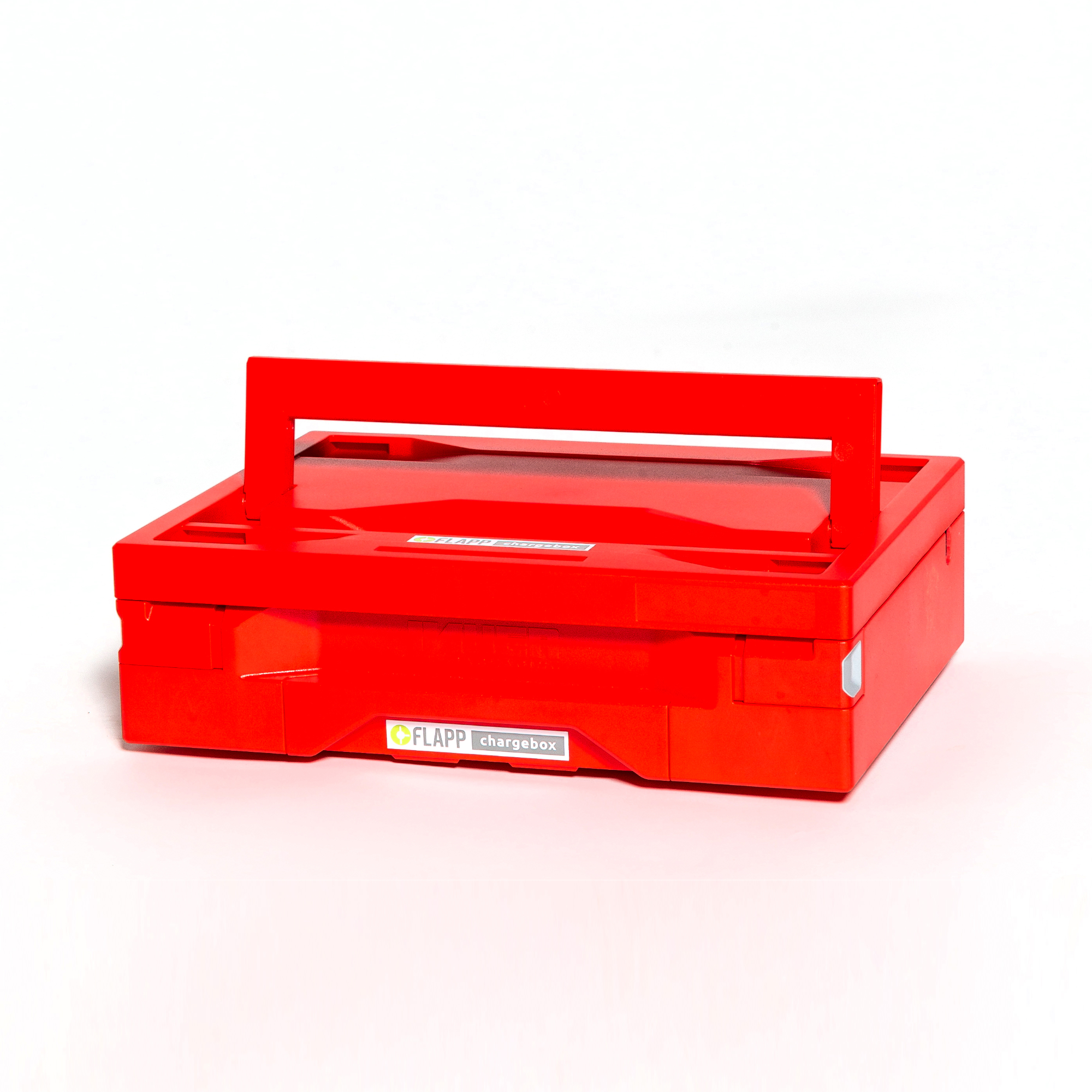 Mit der FLAPP Chargebox laden und transportieren Sie bis zu 6 Akkus bequem und sicher.