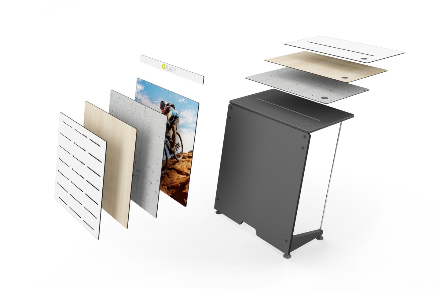 Ma è anche possibile cambiare facilmente superfici e colori, oppure sostituire superfici graffiate senza dover acquistare un nuovo FLAPP 50 completo.