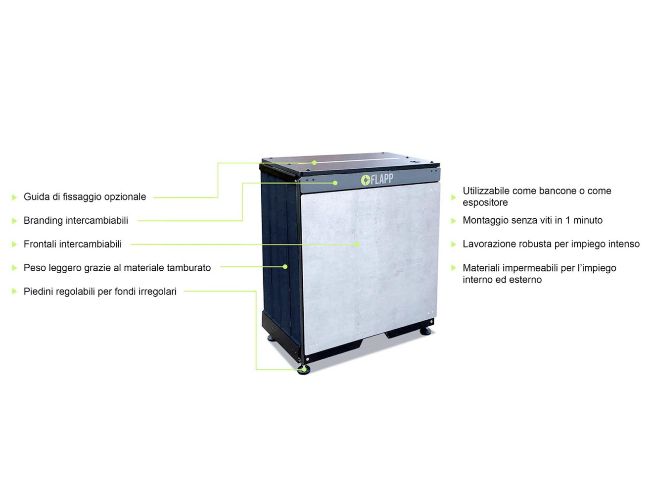 Con FLAPP non avrete solo un bancone mobile, ma anche un sistema a piattaforma studiato, modulare e ampliabile.