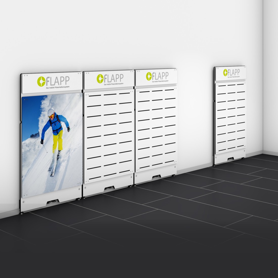 Con il set di supporto parete FLAPP potete fissare il vostro modulo FLAPP verticalmente alle pareti posteriori per posizionare FLAPP 50 verticalmente.